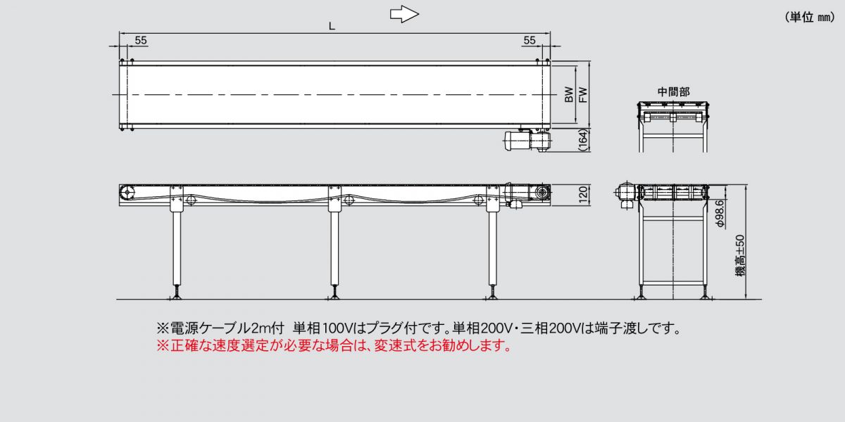 | ベルト幅(BW)/ 機幅(FW) | ・200 / 270 ・300 / 370 ・400 / 470 ・500 / 570 ・600 / 670 |