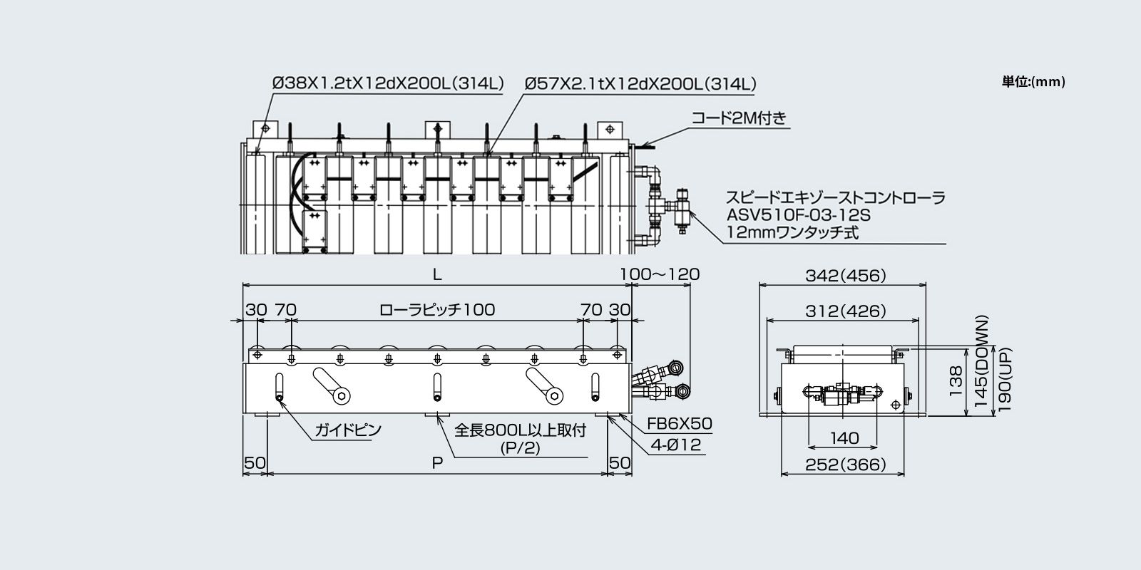 ・T:モータローラと フリーローラとを一本毎 ・B:モータローラブレーキ付き 但しローラ巾314L ※ブレーキ付きの場合はインバータは使用できません。 |