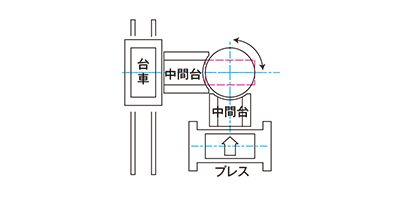 特徴:ターンテーブル機構により金型を90°旋回して搬送。